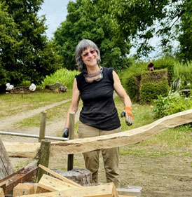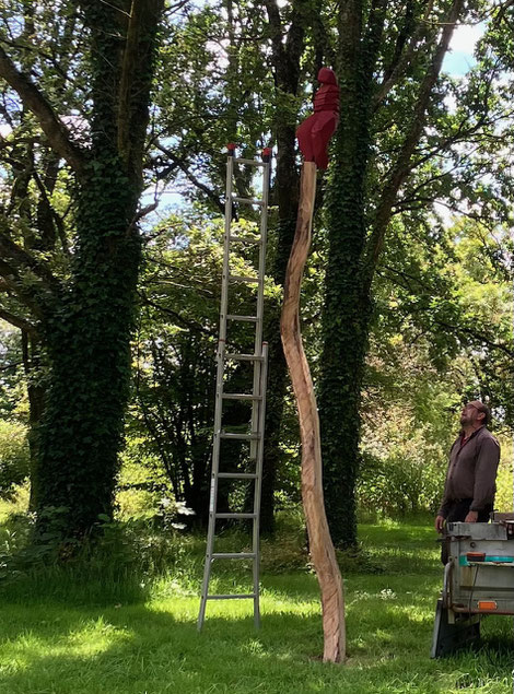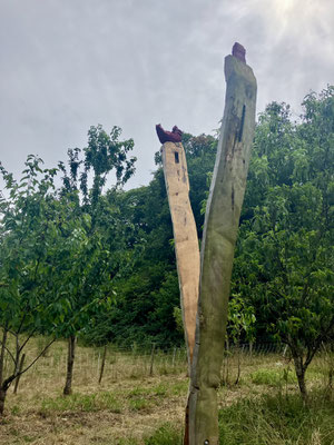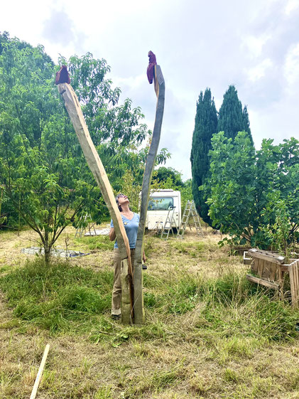 Eté 2025 :" la geôlière la prisonnière", cèdre, chêne, noyer, 4 m de hauteur, photo prise pendant le montage :